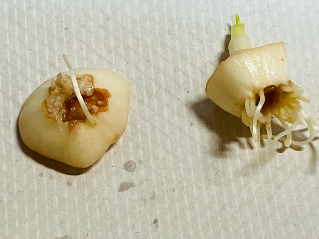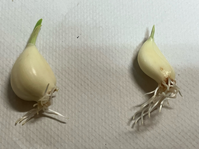 ニンニクは冷蔵庫の中で発芽してしまったものと使ったあとの根っこの部分を水栽培したものどちらも芽と根が出てきました。