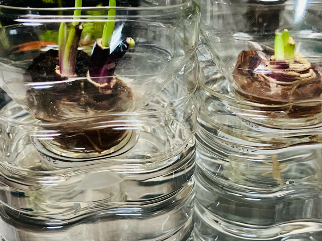 タマネギの根っこの部分も水栽培で2週間ほどで芽や根が伸びてきます。