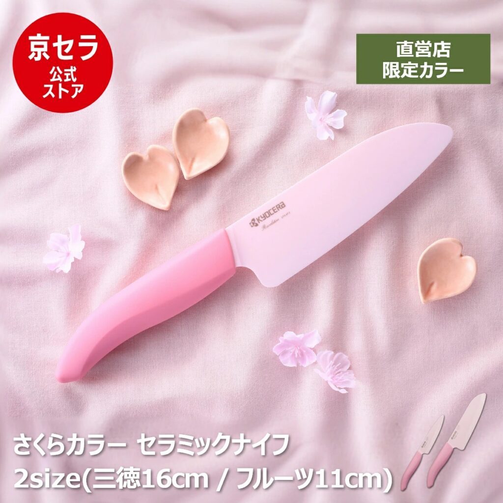 摩耗が少なく切れ味が長続きするセラミック素材の包丁です。軽くて切れ味がよく、食洗器でも洗えるのが特徴。こちらは公式ショップ限定のカラーで桜のような淡いピンク色がきれいなモデルです。